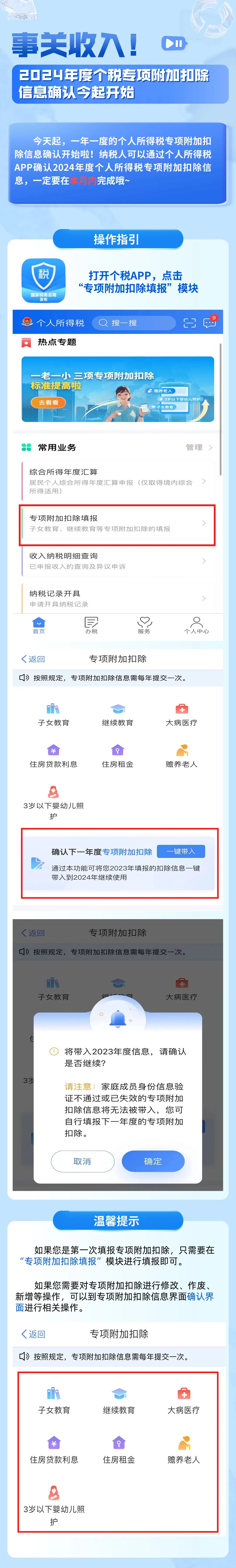 今天起,一年一度的個(gè)人所得稅專項(xiàng)附加扣除信息確認(rèn)開始啦!納稅人可以通過個(gè)人所得稅APP確認(rèn)2024年度個(gè)人所得稅專項(xiàng)附加扣除信息,一定要在本月內(nèi)完成哦~